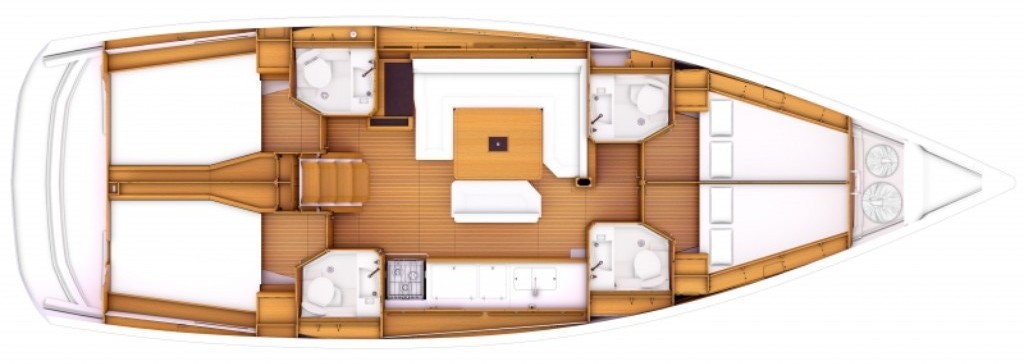 Wnętrze naszego Sun Odysseya 479 jest bardzo przytulne i wygodne. Biała tapicerka, jasne drewno i dużo przeszkleń czynią środek jachtu bardzo widnym i przyjaznym.